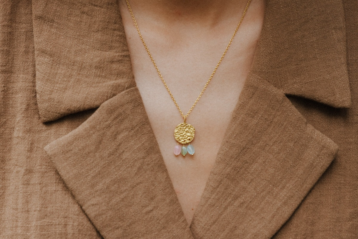 El cuarzo rosa es bonito, pequeñito tono no muy intenso. La cadena es corta y fija al cuarzo, va engastado de tal forma que no se puede cambiar a otra cadena diferente